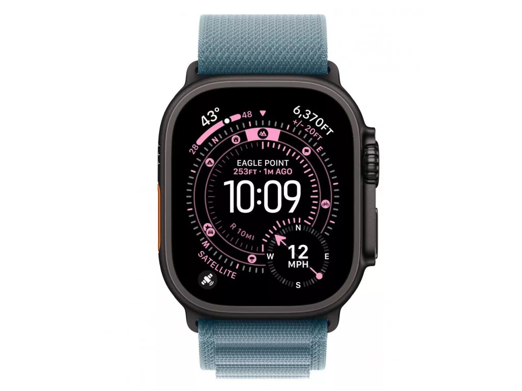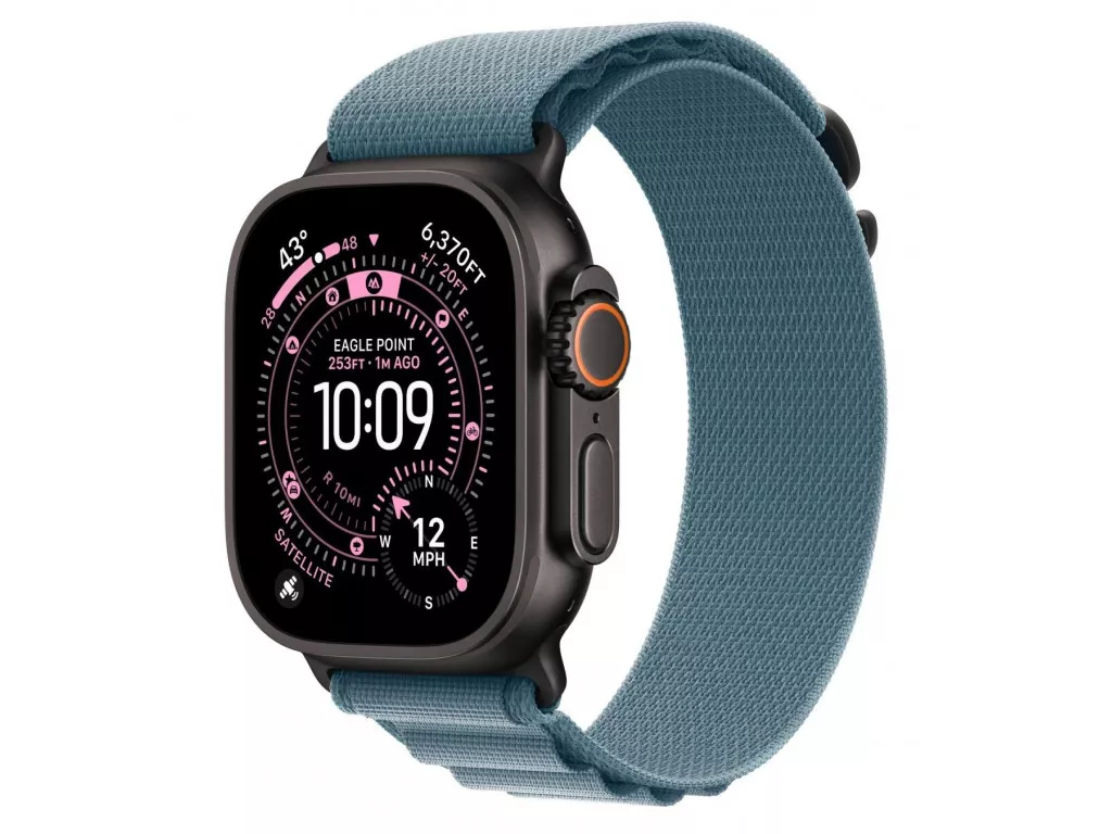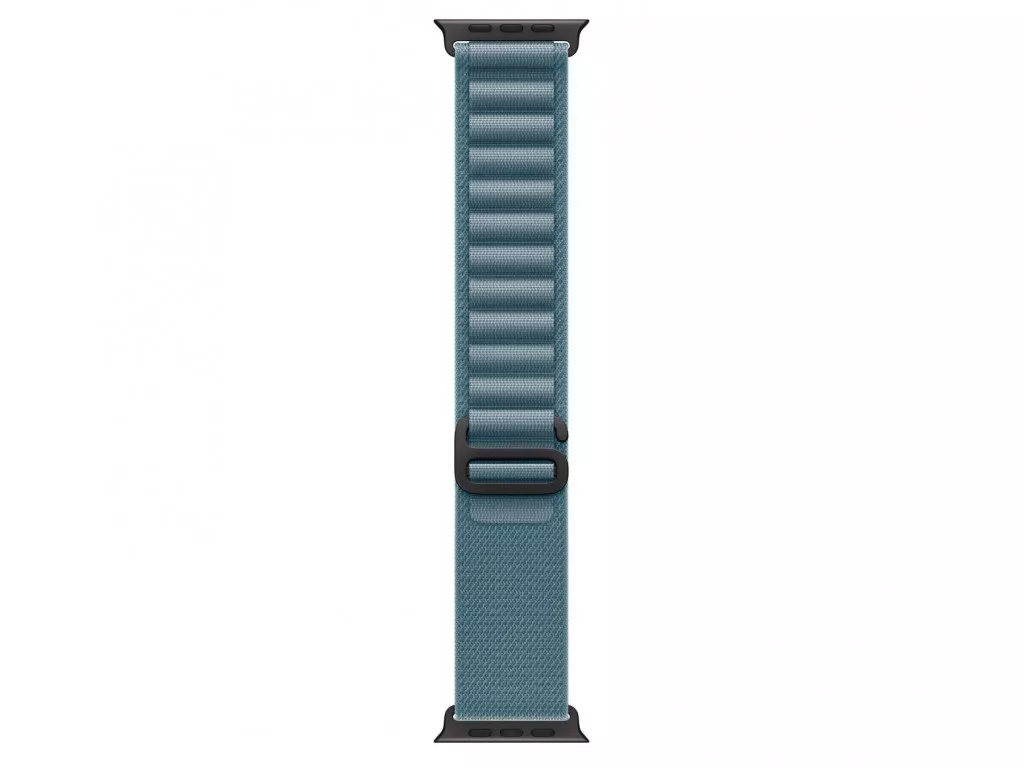 Ремешок Alpine Loop | Для любителей активного отдыха | Удобный, но чрезвычайно прочный | G-образный крючок обеспечивает надежную фиксацию | Совместим с Apple Watch Ultra 49mm | Размер Large: на запястье обхватом 165‑210 мм | Light Blue | Отделка корпуса Apple Watch Black Titanium