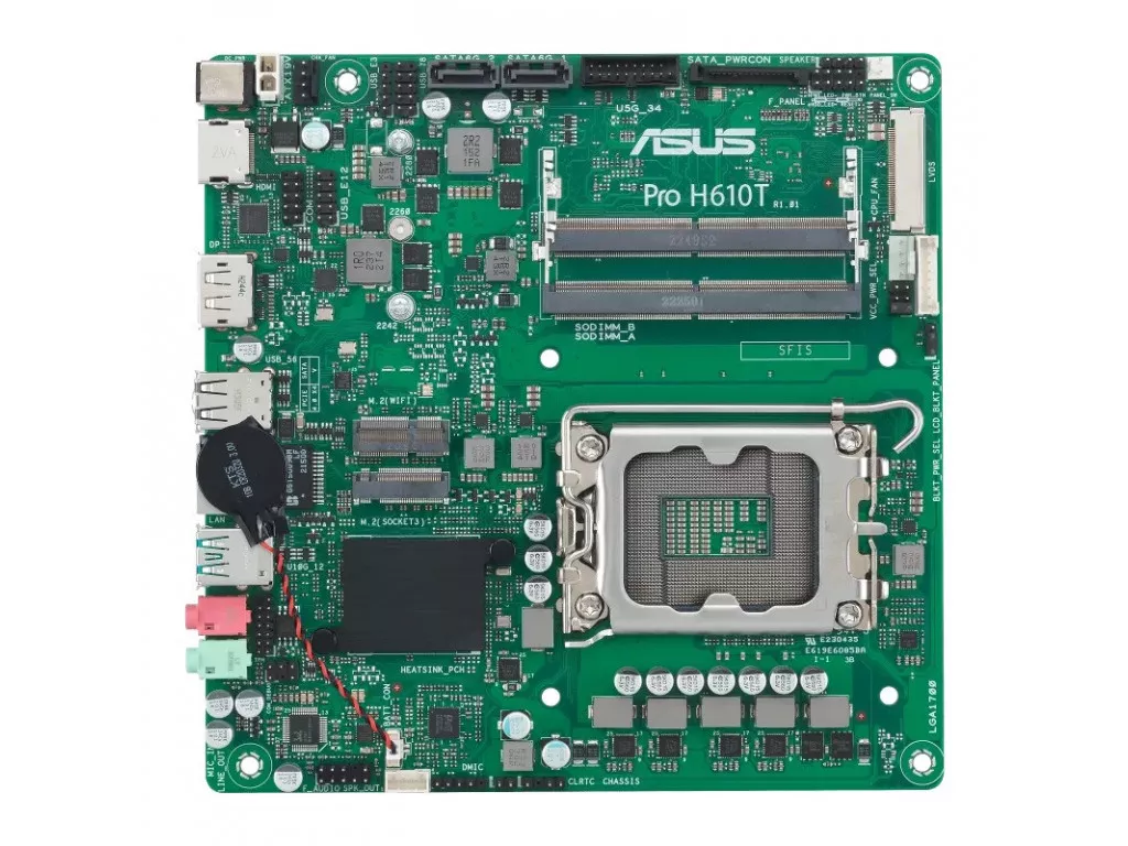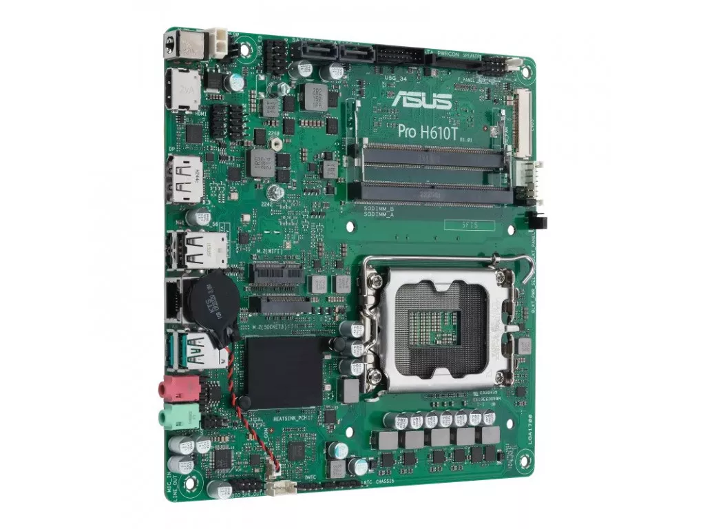 Socket 1700 | Чипсет Intel H610 | Память 2 слота SO-DIMM DDR5 5600 MHz, max 64 Gb | Разъем M.2 x 1 | Видеокарта интегрирована в процессор Intel | Выходы для монитора DisplayPort, HDMI, LVDS connector | Форм-фактор Thin Mini-ITX