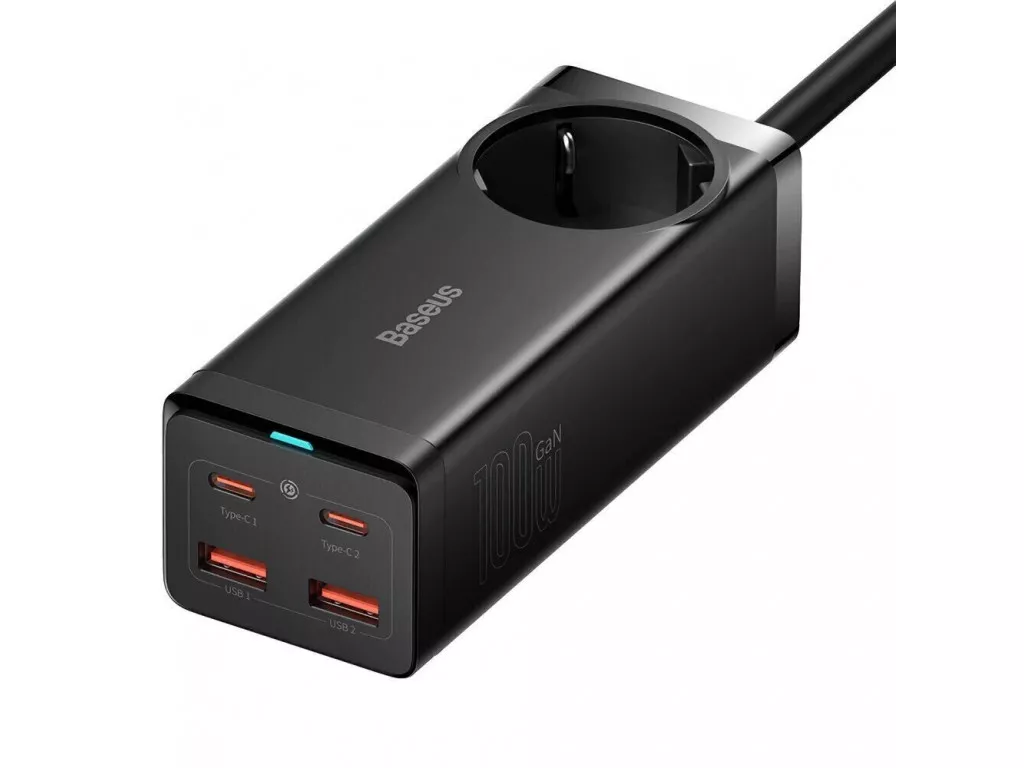 Порт зарядки: USB Type-C x2, USB-A x2, розетка | Мощность 100 Вт | Поддержка быстрой зарядки Power Delivery, Quick Charge 4.0, PPS, Samsung AFC, Huawei FCP | Технология GaN3 Pro | Высокая мощность 100 Вт подходит для зарядки ноутбука с входом Type-C | Размеры: 120 x 48 x 41 мм, Вес 513 г | Черный | В комплекте кабель Type-C to Type-C 1m