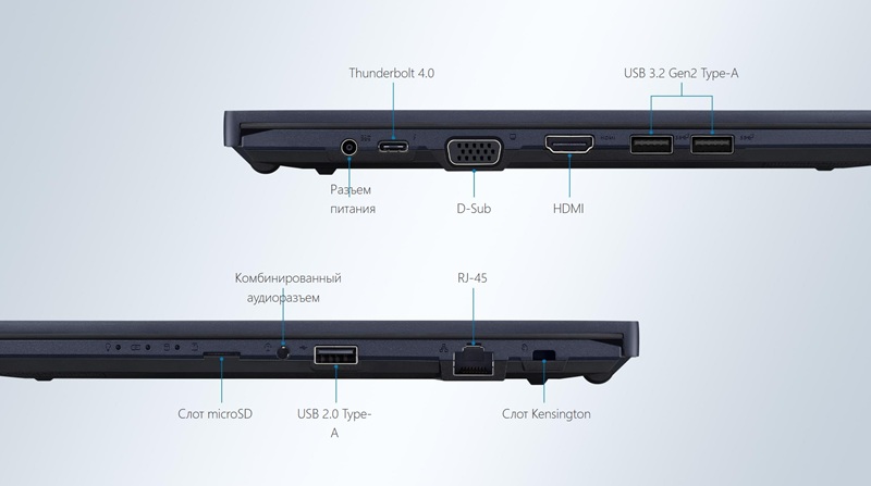 Для бизнес-ноутбука очень важно иметь множество интерфейсов, позволяющих подключать всевозможное периферийное оборудование. Модель ExpertBook B1 предлагает полноценный комплект, включающий Thunderbolt 4 (40 Гбит/с, видеовыход на два дисплея, ускоренная подзарядка), два порта USB 3.2 Gen2 и один USB 2.0, видеовыход HDMI 2.0, разъем проводной сети Ethernet и слот для карт памяти microSD. Интерфейсные разъемы отличаются повышенной надежностью и прошли тест на более чем 10 000 циклов подключения/отключения кабеля.