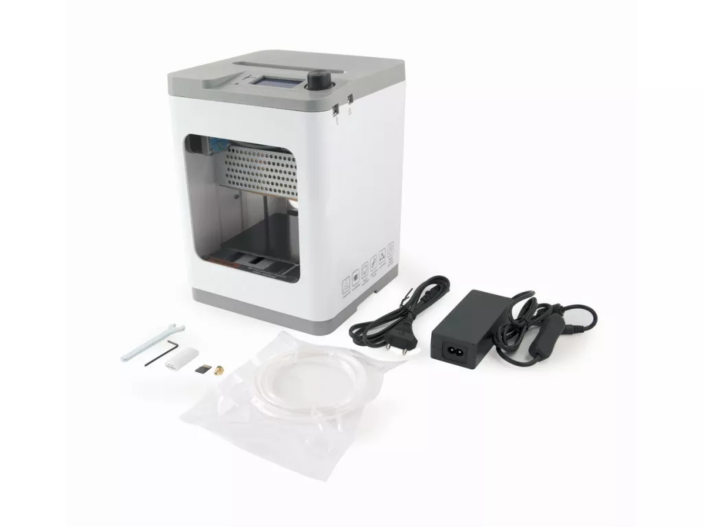 3D-принтер I Метод послідовного наплавления (FDM/FFF) | Матеріал друку PLA | Робоча область: 120 х 100 х 100 мм | Кількість друкувальних головок 1 | Діаметр сопла 0.4 мм | Діаметр нитки 1.75 мм | Слот для SD-карт | Автоматична подача і втягування філамента | Магнітна платформа з функцією автоматичного вирівнювання | Практичний 3.5-дюймовий світлодіодний дисплей | Температура екструдера: до 250°C | Розміри 290 x 210 x 210 мм | Вага 3 кг | Білий