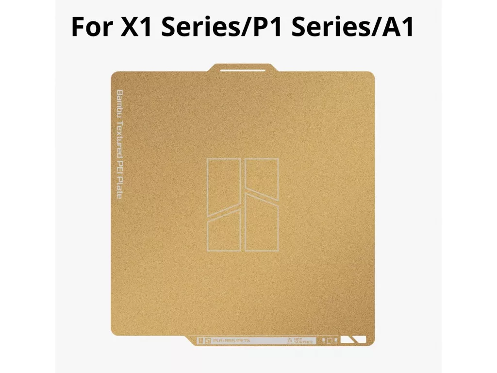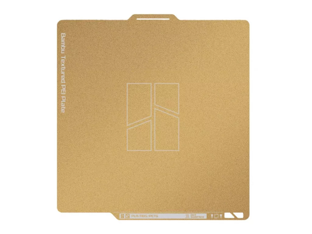 Особливості | Золота текстурована пластина PEI від Bambu Lab – це гнучка магнітна робоча платформа з напиленим золотим PEI-покриттям. Під час друку пластина забезпечить відмінну адгезію та легке видалення відбитка після остигання. |