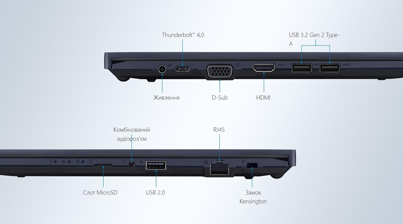 Для бізнес-ноутбука дуже важливо мати широкий набір інтерфейсів для підключення різноманітного периферійного обладнання. Модель ExpertBook B1 пропонує повноцінний комплект інтерфейсів, що включає Intel Thunderbolt 4 (40 Гбіт/с, відеовихід з підтримкою підключення двох моніторів, прискорене заряджання), два порти USB 3.2 Gen 2 і один USB 2.0, відеовихід HDMI 2.0, роз'єм дротової мережі Ethernet і слот для карт пам’яті microSD. Інтерфейсні роз'єми відрізняються підвищеною надійністю та пройшли тестування на більш ніж 10 000 циклів підключення/відключення кабелю8.